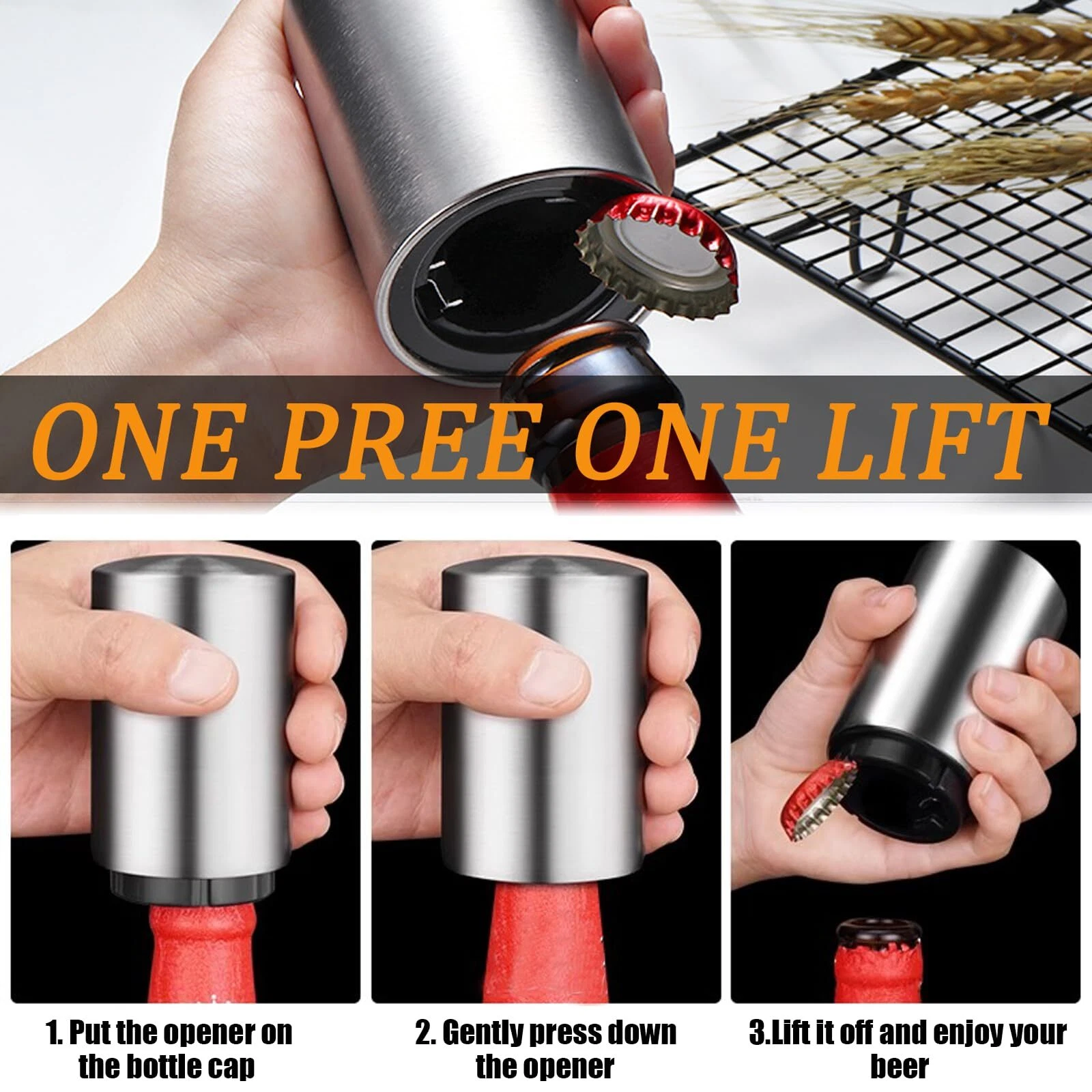 - STURDY-EXQUISITE - This magnetic automatic push down bottle opener is made of high-quality stainless steel, went through wire drawing treatment, made the beer cap opener sturdy. So this bottle wine opener has good handing feeling, and easy to clean. At the same time, the automatic bottle cap opener looks delicate and fashion. The beer bottle cap opener is not only a practical and pop the top bottle opener, but also a delicate decoration for your kitchen. Love destapadores de cerveza!